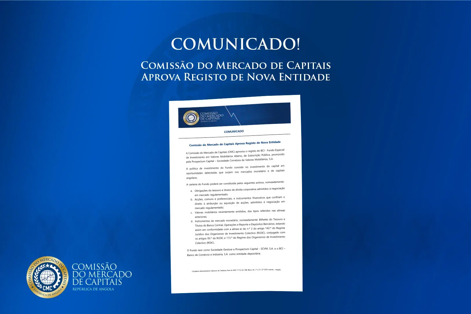 A Comissão do Mercado de Capitais é a entidade reguladora do mercado de capitais em Angola. O nosso compromisso é garantir a integridade, transparência e desenvolvimento sustentável do mercado de capitais, promovendo a confiança dos investidores e a inovação financeira.